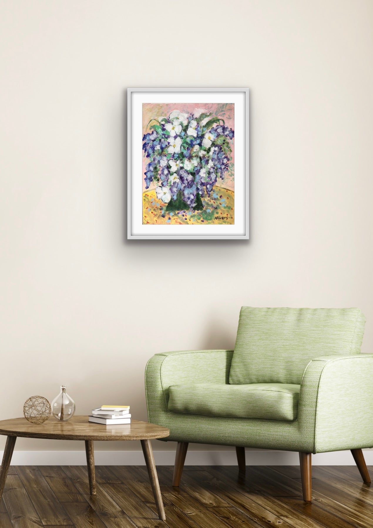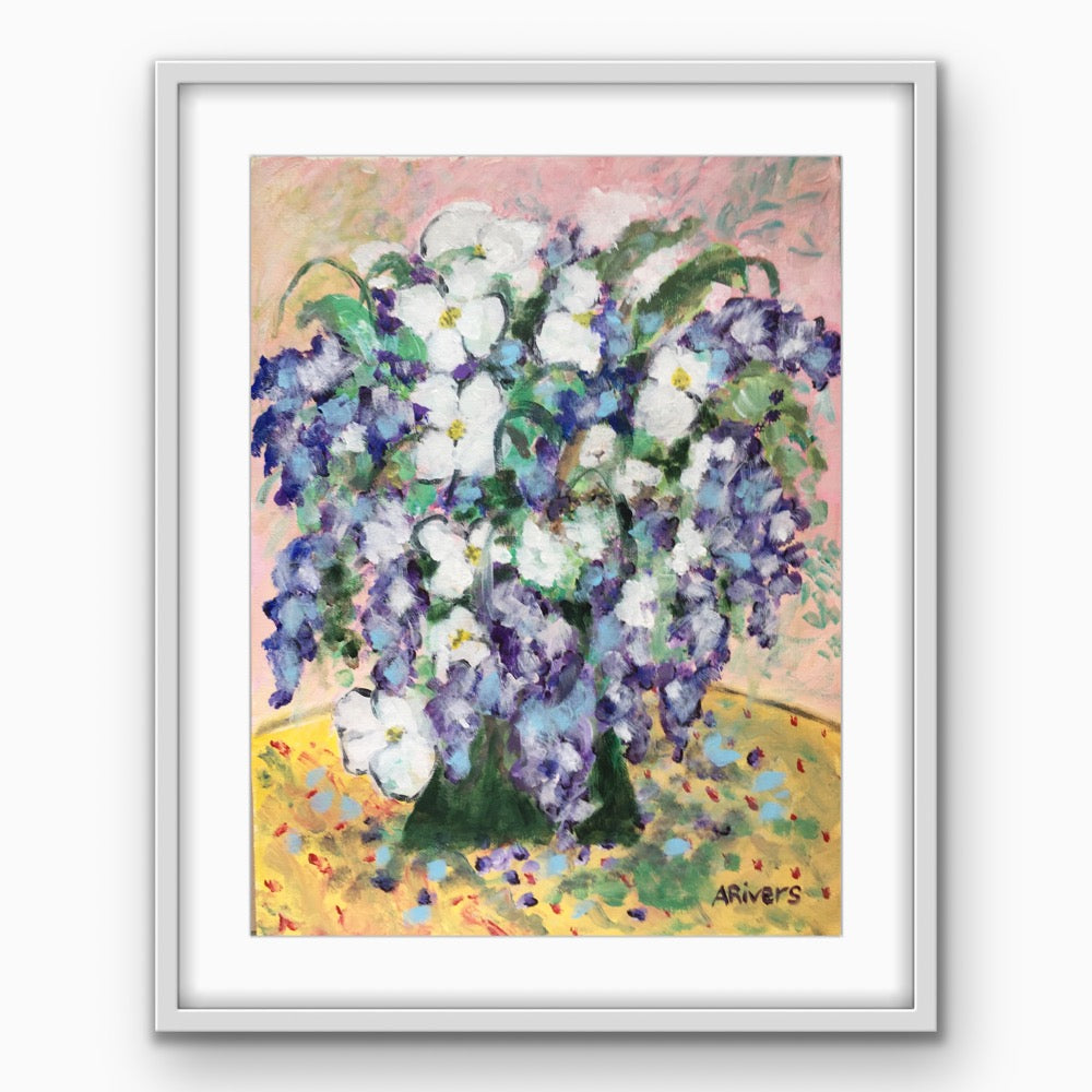 Summer has returned with its abundance of flowers and colors. Let's pick a bouquet of white and lavender blue blossoms from the garden. A fragrant bouquet of meadow blooms finds its way into a broad flower vase. What a lovely still life it makes!
