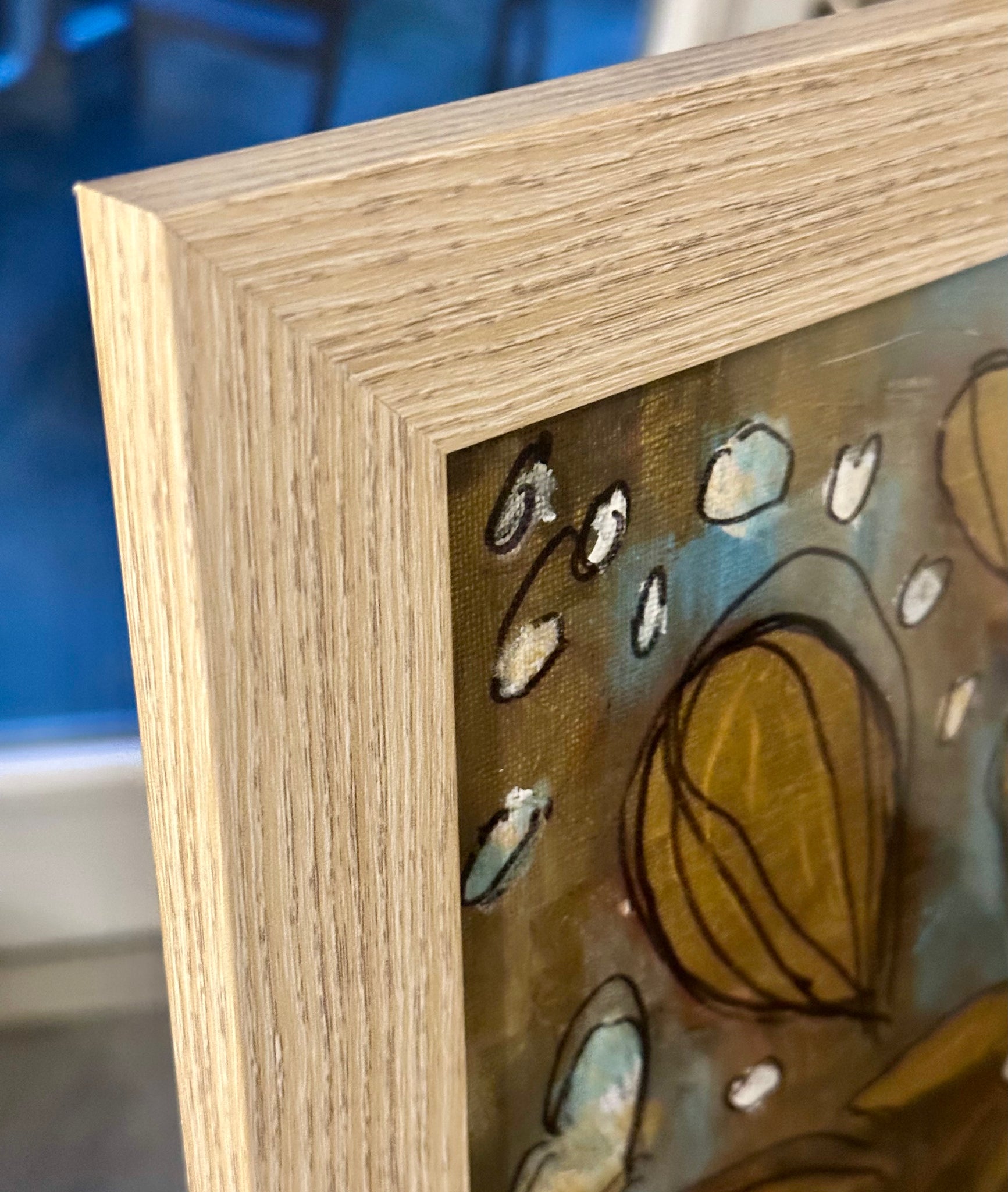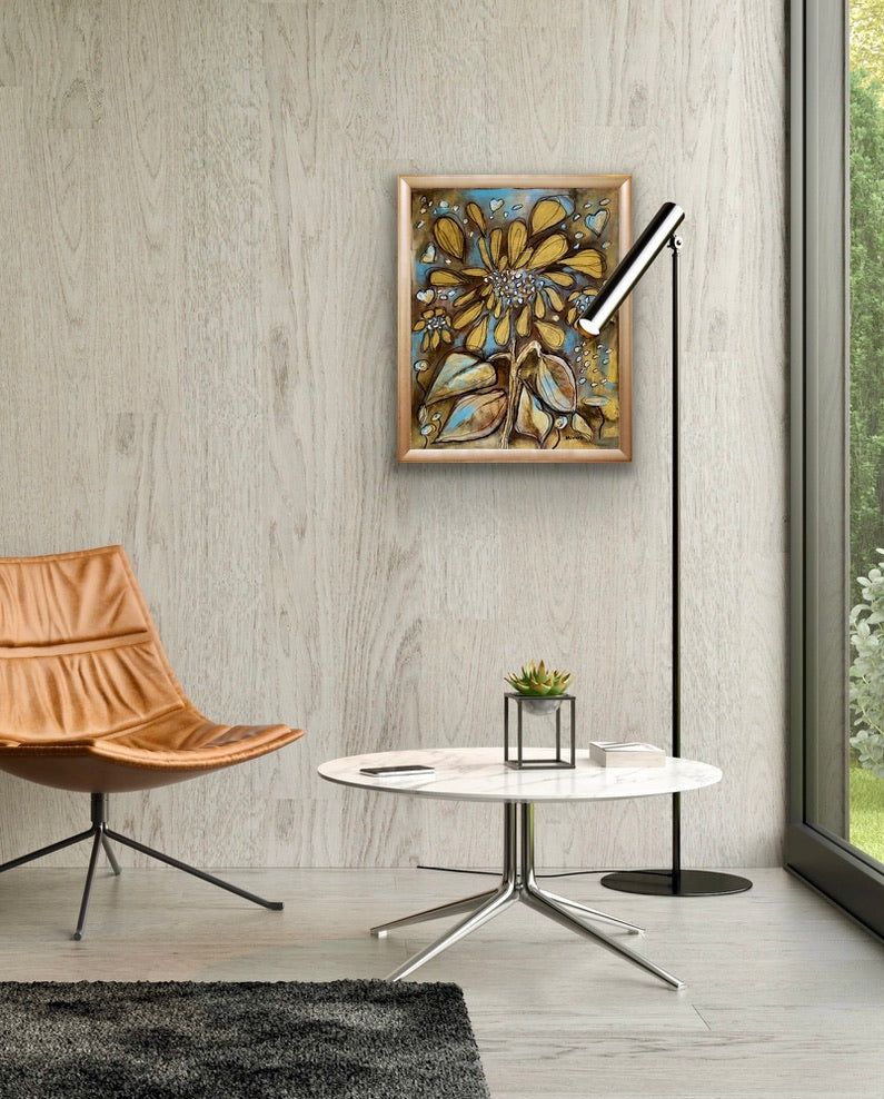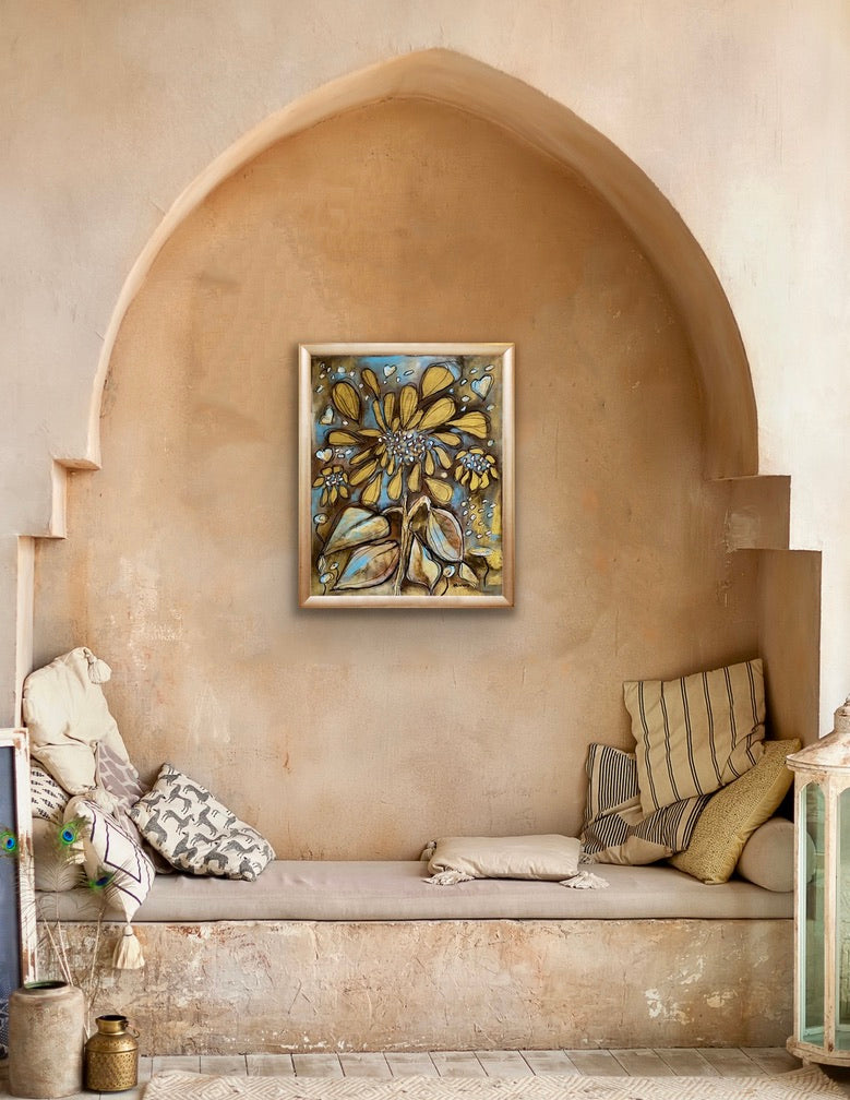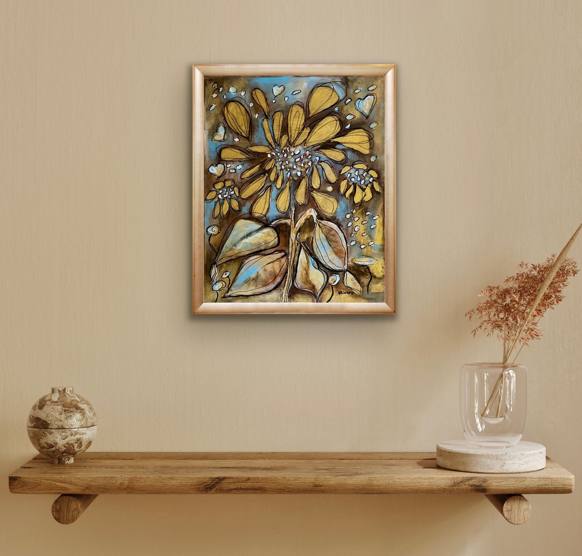 Original painting of sunflowers appearing golden on a late summer afternoon right before sunset.  The sky looks blue and some grey from the waning hours of the day. A little tan and brown earth tones round out the picture. Painted with love, can you find it?
